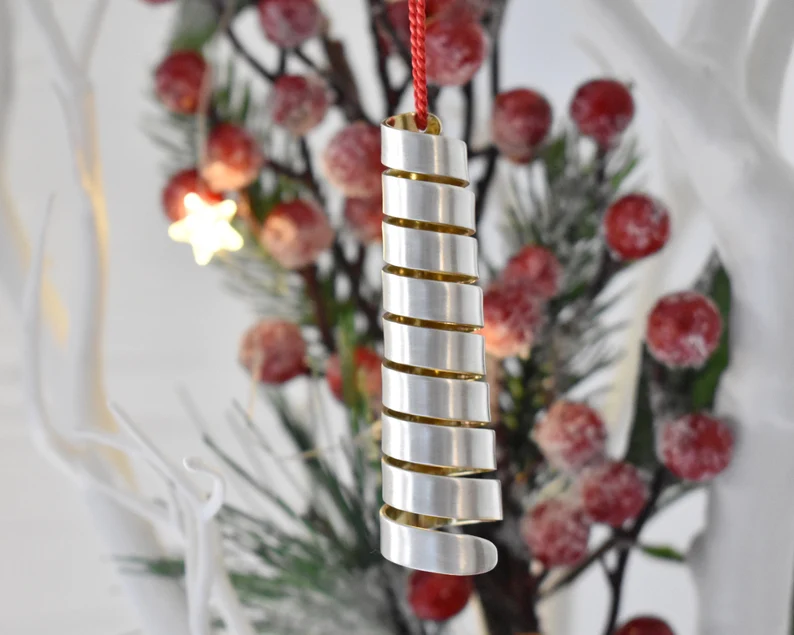 The twirl is provided with a choice of either a handmade sterling silver hook or a red ribbon/cord in which to hang on to your tree.