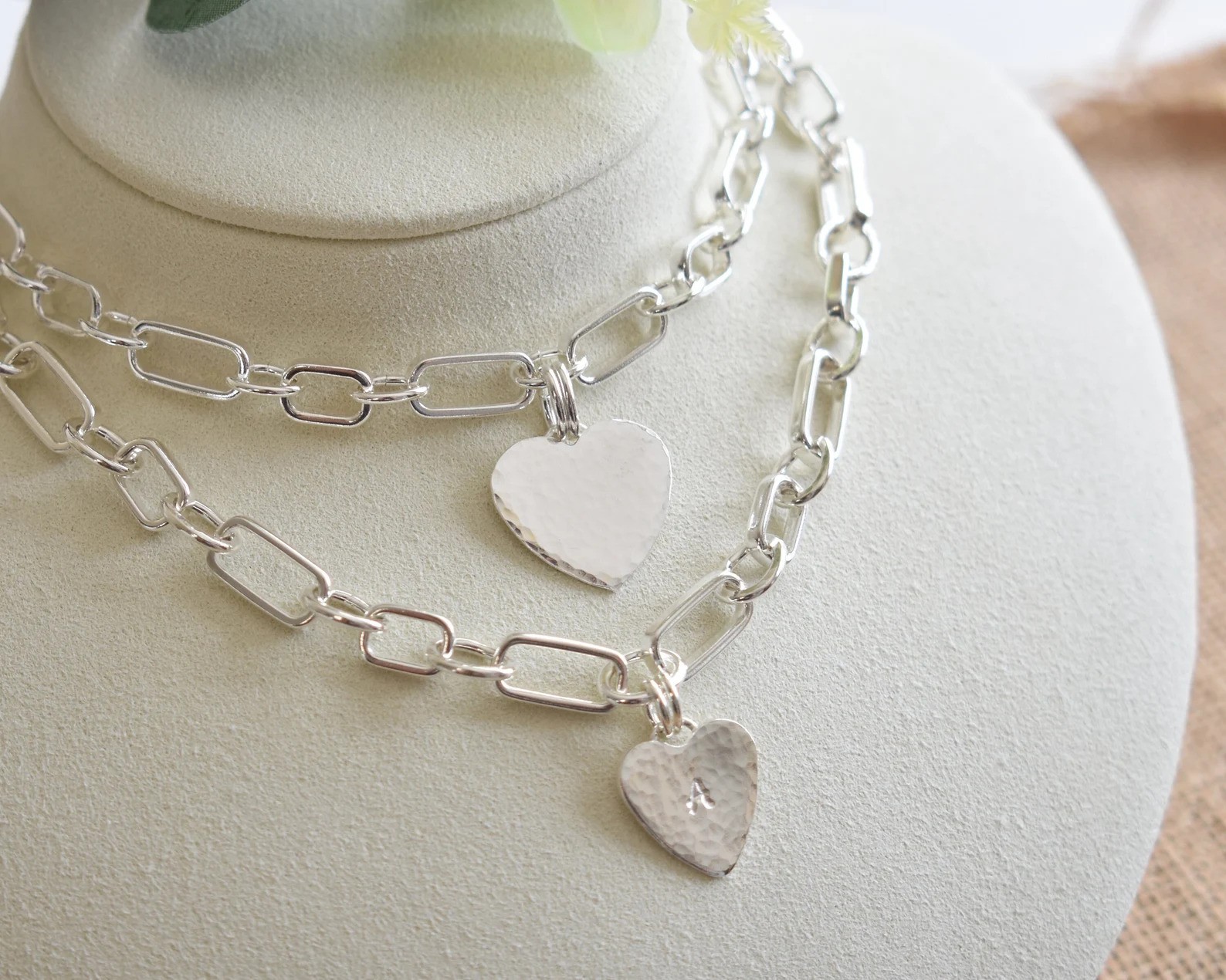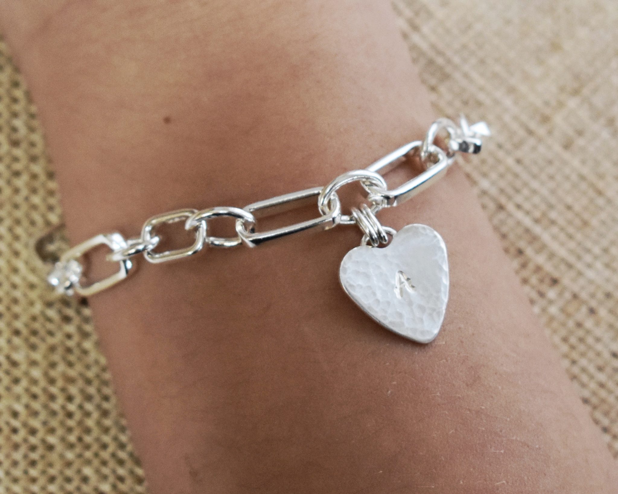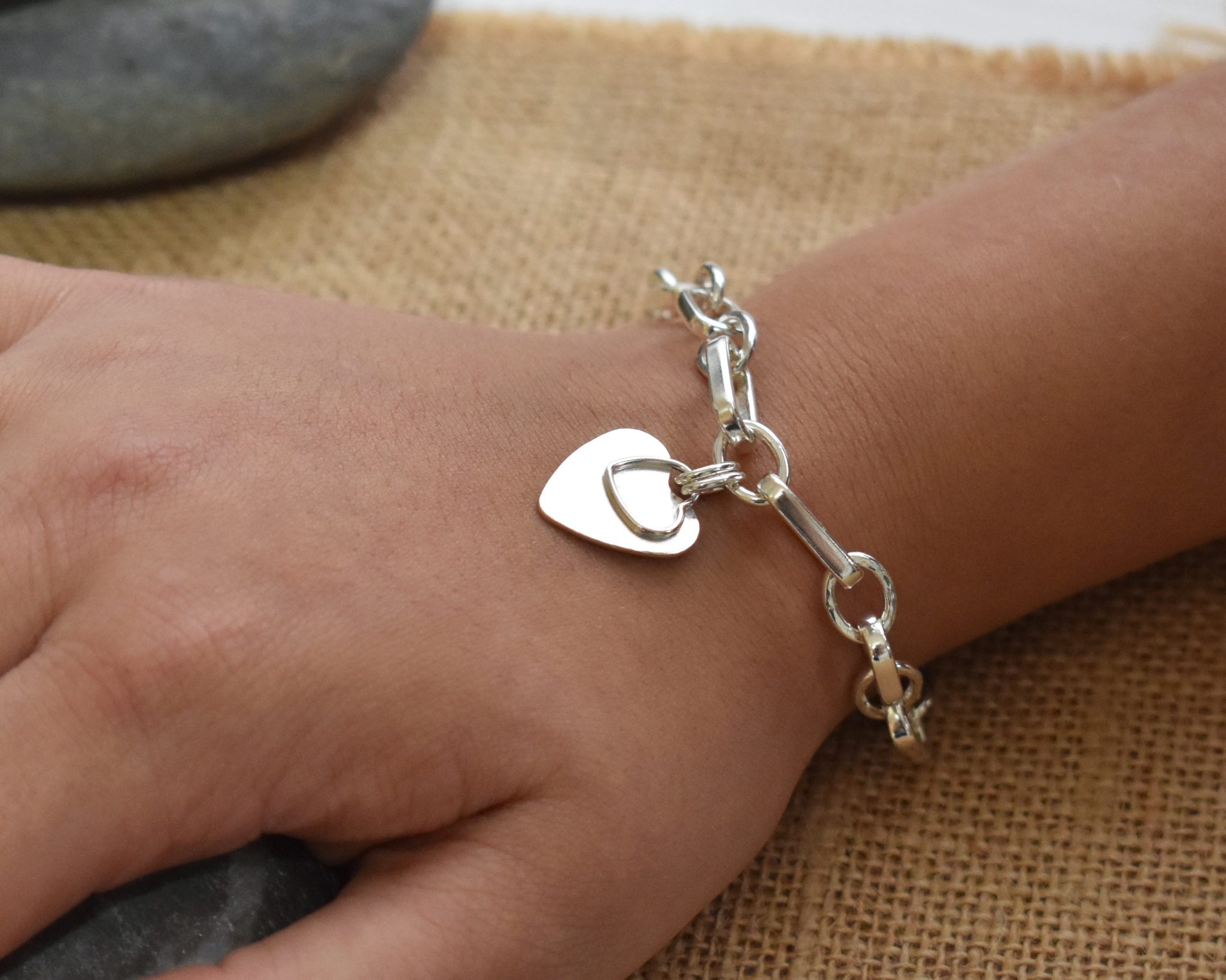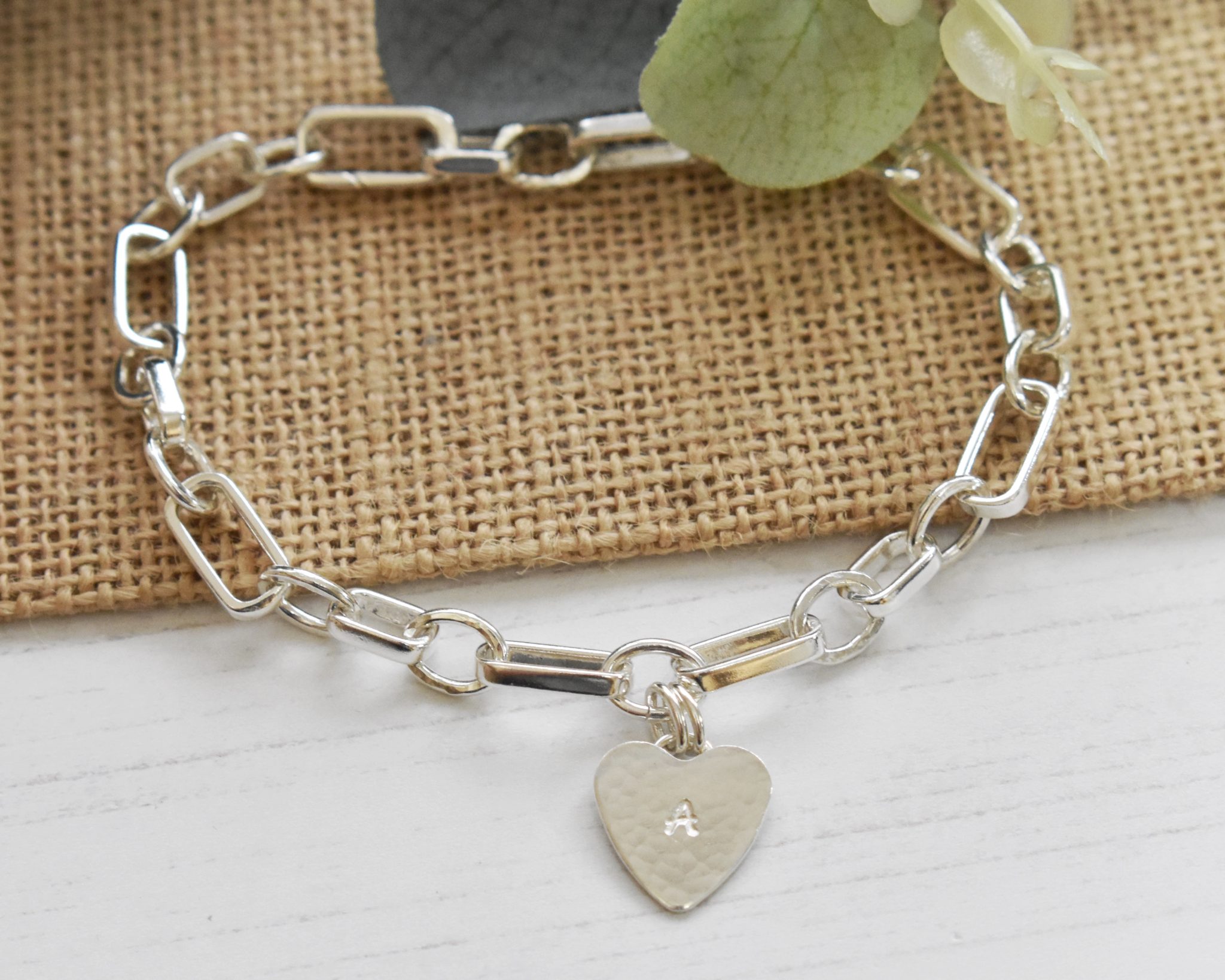 This handmade sterling silver rectangular and oval bracelet showcases a timeless design that effortlessly blends modern sophistication with classic charm. The rectangles are two different sizes which are then connected by a gently hammered oval ring, in the centre sits a sterling silver heart which can be personalised if required.