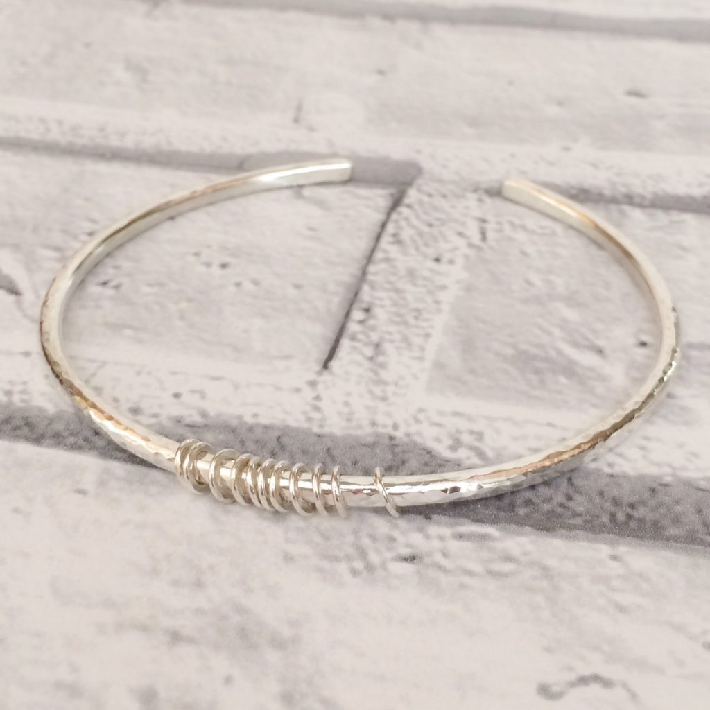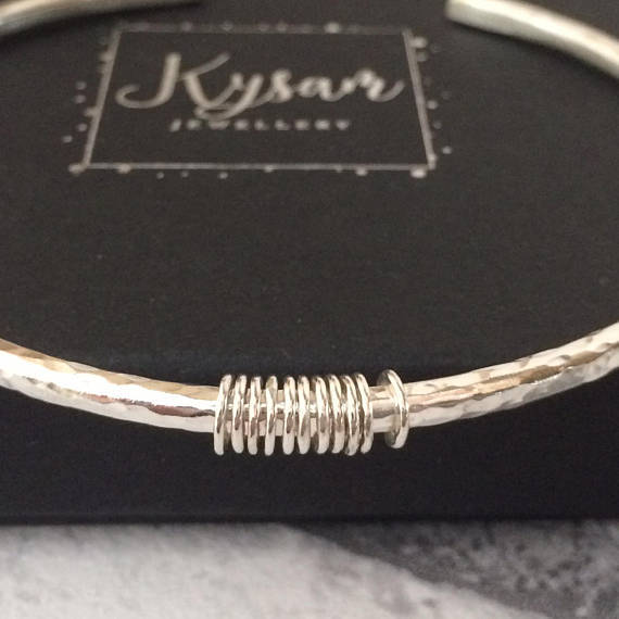 A handmade 3mm solid sterling silver textured cuff with handmade tiny 9ct gold or sterling silver hammered rings attached that move freely around the bangle.