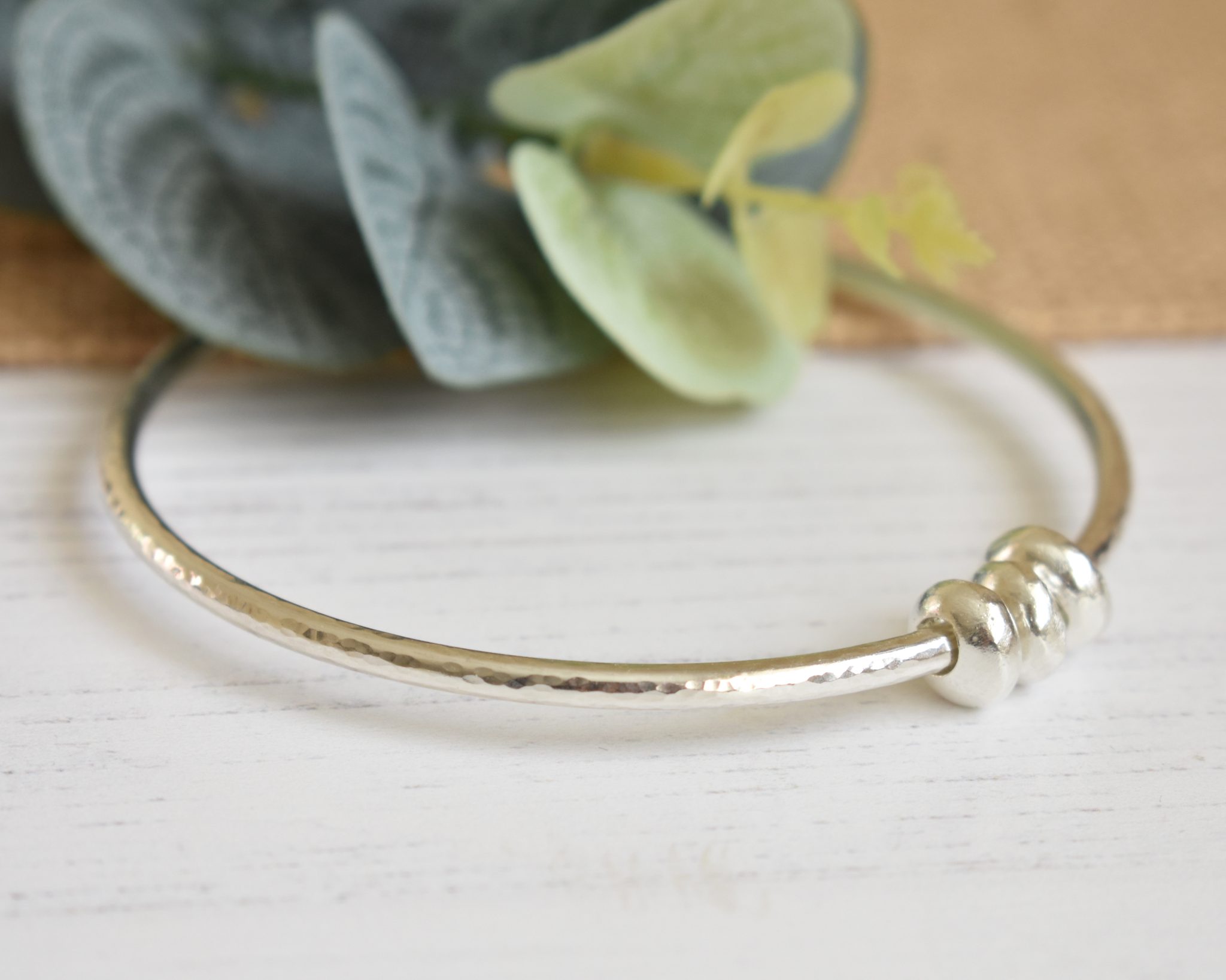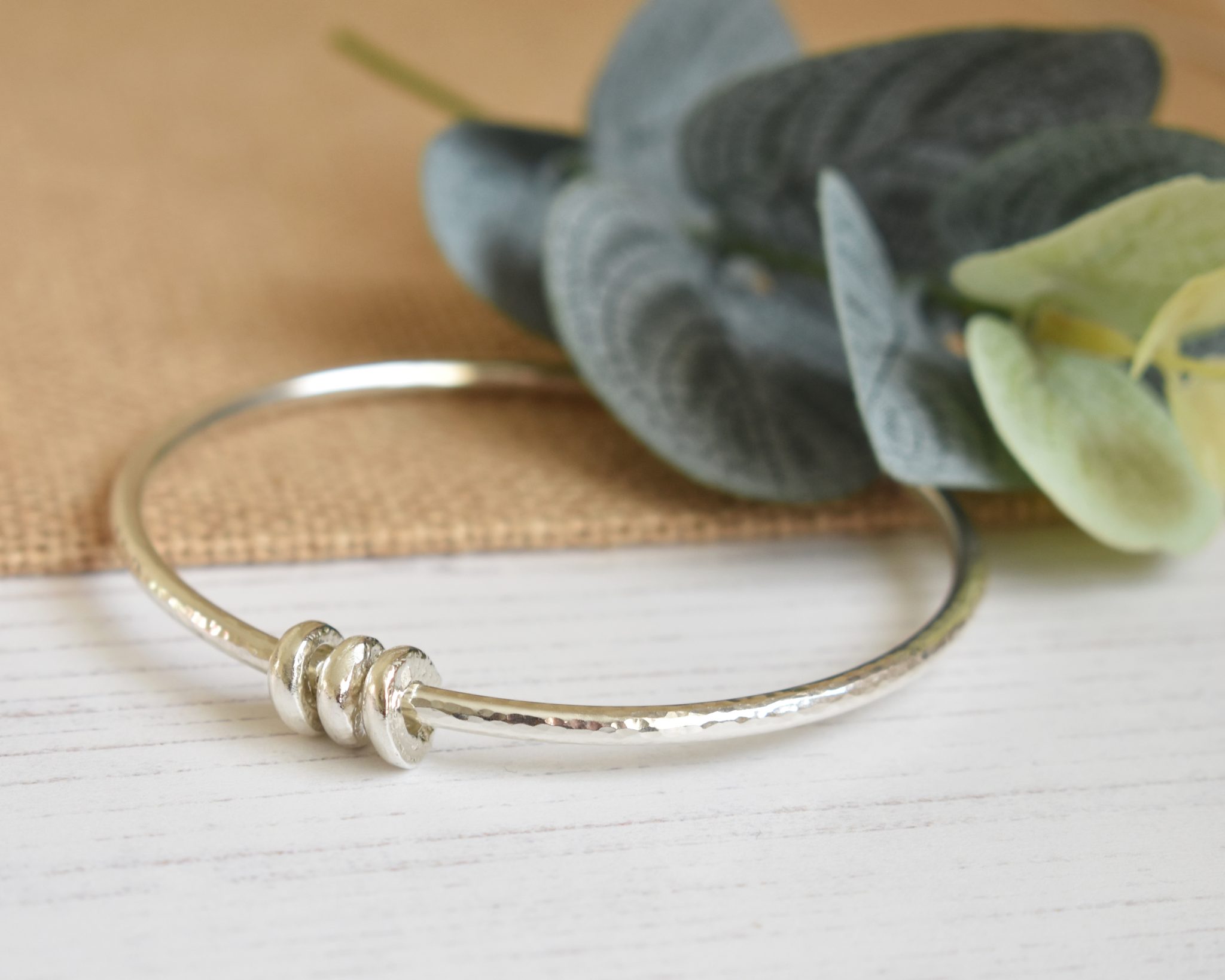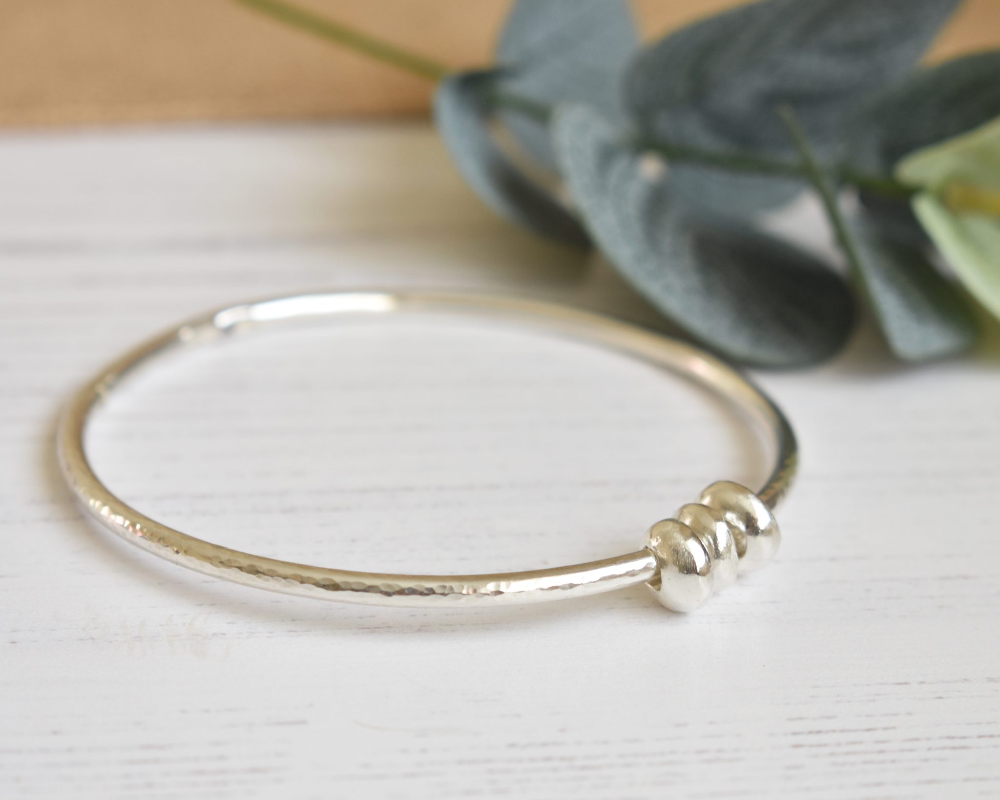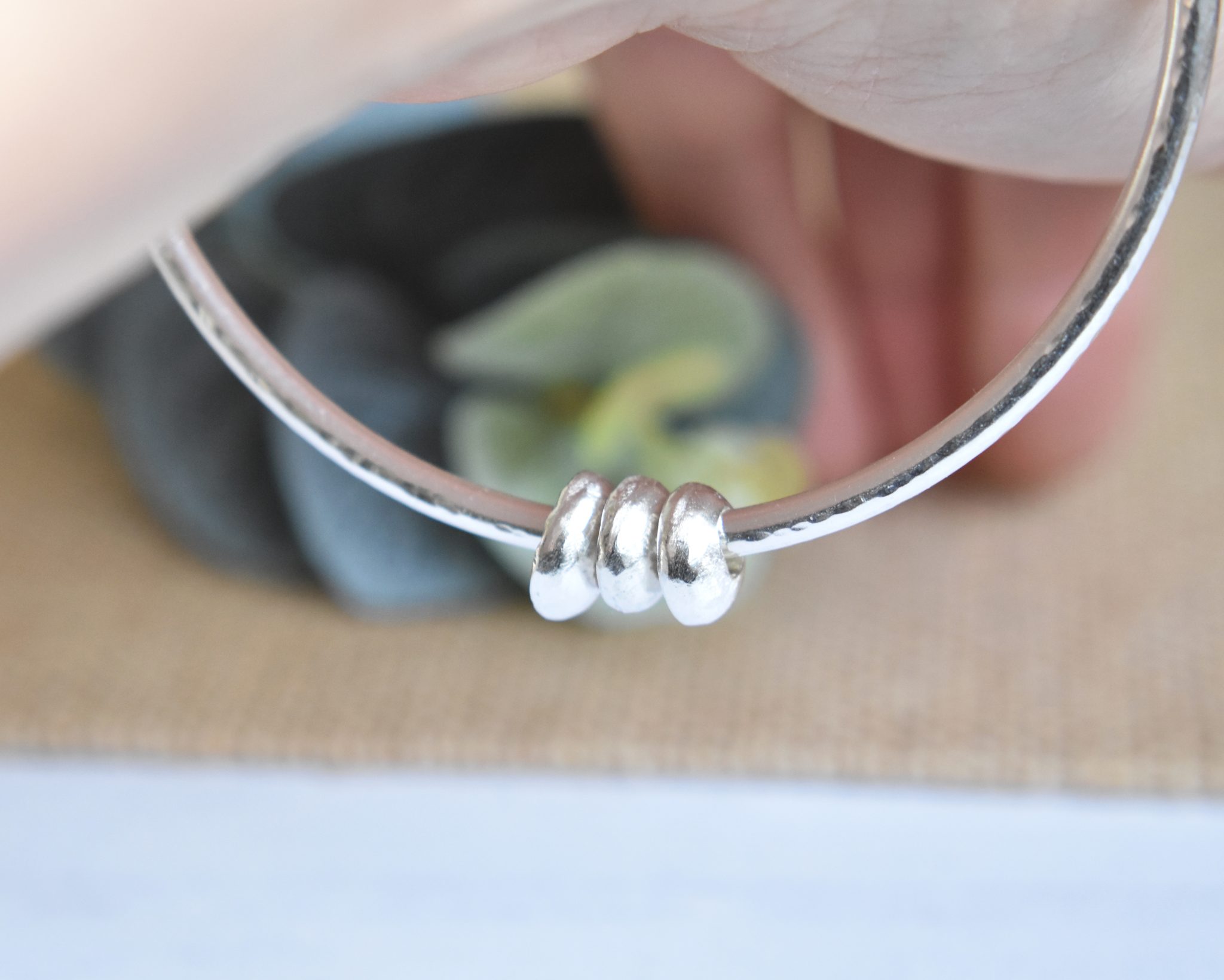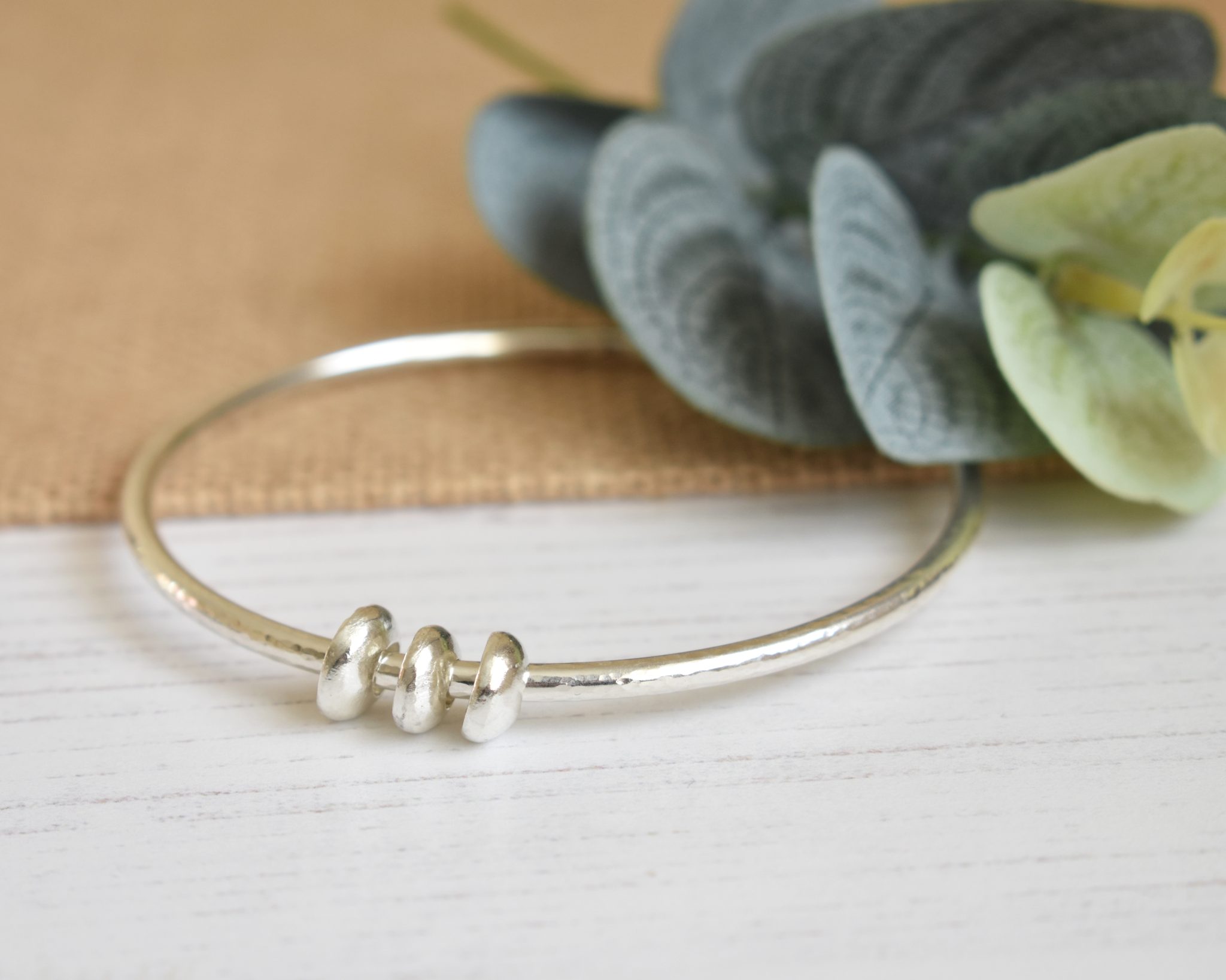 An elegant and simple sterling silver hammered bangle featuring 3 silver pebbles which forms part of my Zero Waste collection.